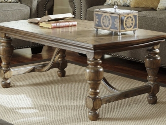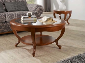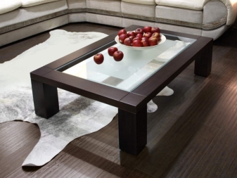كقاعدة عامة ، الطاولات الخشبية مصنوعة بالكامل من الخشب ، ولكن في نفس الوقت ، يتم استخدام إدخالات من المعدن والزجاج ، كما يتم تصنيع العناصر الفردية للإطار من المواد المدرجة..
