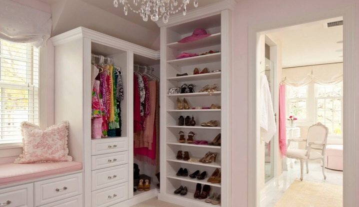 لا يجب أن تحتوي خزانة الزاوية على أبواب ، في بعض الأحيان تبدو النماذج المفتوحة أكثر إثارة للاهتمام. إذا أرادت إحدى مصممي الأزياء عرض مجموعتها ، فإن الرفوف المفتوحة تعد خيارًا جيدًا. عند وضع الأحذية عليها ، سيظهر تأثيرًا زخرفيًا مثيرًا للاهتمام ، مما يجعل هذه المجموعة مركزًا للتكوين الداخلي.