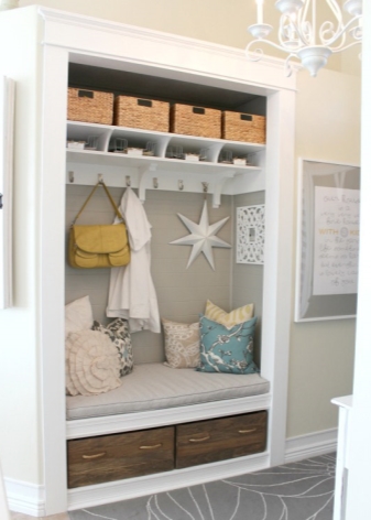 يمكن أن تكون خزانة الملابس المدمجة في مكانها المناسب مفتوحة تمامًا ، ولكن كل ما هو مطلوب تقريبًا في الردهة يمكن أن يكون مناسبًا هناك. هذا مكان للملابس والأحذية ، يوجد مقعد مريح للجلوس وتغيير الأحذية. لا شيء لا لزوم له ، ولكن كل شيء مريح للغاية وجميل.