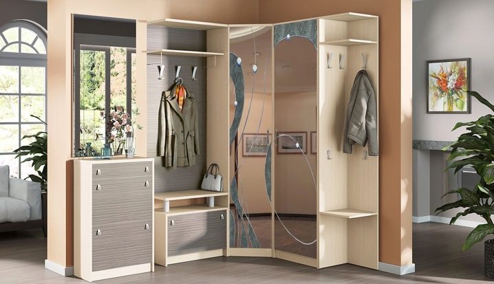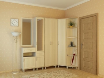 - ركن. سوف تتناسب نسخة الزاوية الضيقة من الخزانة بشكل أفضل مع المساحة الصغيرة من الرواق. تشغل زاوية واحدة ، وتترك باقي المساحة خالية. غالبًا ما توجد خزانة زاوية معكوسة. التصميمات الأكثر شيوعًا هي عنصر زاوية ومقصورات إضافية على الجانبين..