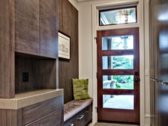 منطقة مدخل لطيفة مع أريكة صغيرة. ستساعد خزانة صغيرة نسبيًا من هذا التصميم في استيعاب عدد كبير من الأشياء ، بينما تظل غير مرئية تقريبًا بسبب التصميم الغامق للواجهات..