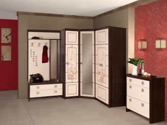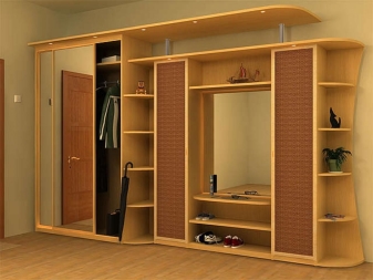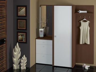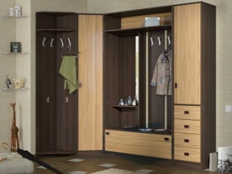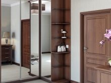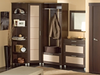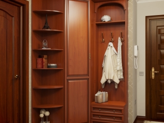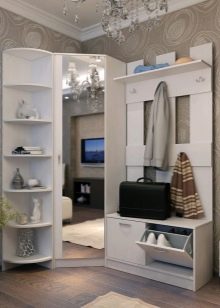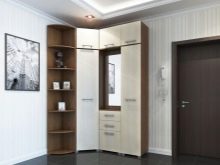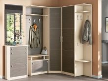 - ركن. سوف تتناسب نسخة الزاوية الضيقة من الخزانة بشكل أفضل مع المساحة الصغيرة من الرواق. تشغل زاوية واحدة ، وتترك باقي المساحة خالية. غالبًا ما توجد خزانة زاوية معكوسة. التصميمات الأكثر شيوعًا هي عنصر زاوية ومقصورات إضافية على الجانبين..