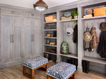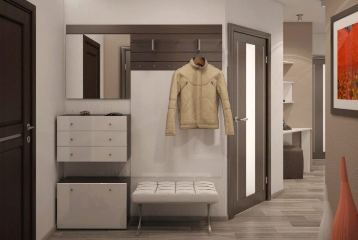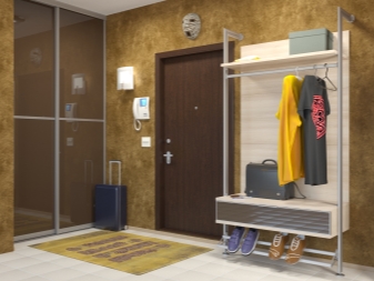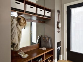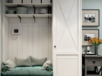 يمكن أن تكون خزانة الملابس المدمجة في مكانها المناسب مفتوحة تمامًا ، ولكن كل ما هو مطلوب تقريبًا في الردهة يمكن أن يكون مناسبًا هناك. هذا مكان للملابس والأحذية ، يوجد مقعد مريح للجلوس وتغيير الأحذية. لا شيء لا لزوم له ، ولكن كل شيء مريح للغاية وجميل.
