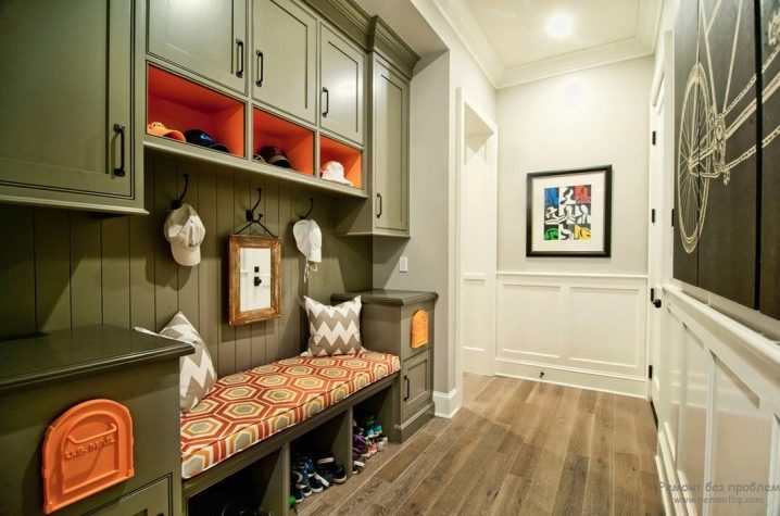 في الردهة ، حيث تم تصميم لون السقف والجدران بألوان داكنة ، يبدو الأثاث الفاتح أفضل ، على سبيل المثال ، باللون البيج واللحم والرماد وظلال القهوة. بالنسبة لأصحاب الشقق الذين يجدون هذه الألوان مملة للغاية ، من الممكن أيضًا استخدام الألوان الزاهية لخزائن الأثاث. على سبيل المثال ، خزانة زيتون في رواق صغير.
