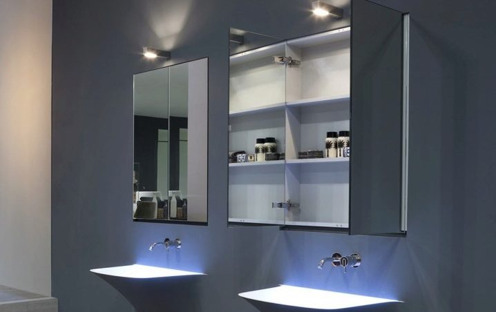 في الحمام ، ستصبح خزانة الملابس مع المرآة السمة التي لا غنى عنها. يمكن أن تكون خزانة حائط صغيرة مع مرآة. يتم تعليقه على الحائط فوق الحوض ، وبالتالي يوفر مساحة أكبر على الأرضية. يمكن تخزين العديد من ملحقات الحمام (الشامبو والصابون ومنتجات النظافة والكريمات) ومجفف الشعر ومكواة الشعر وشفرات الحلاقة.