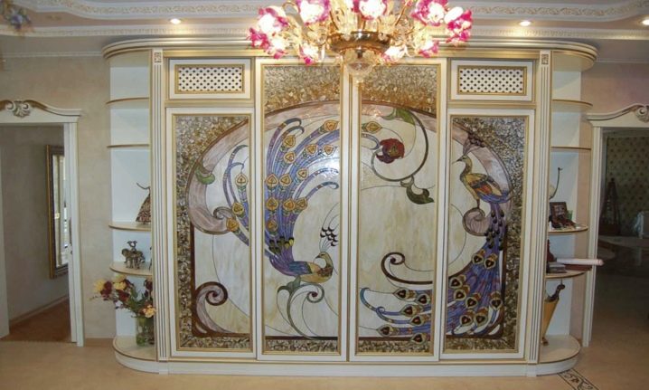 عارضات ازياء مع زجاج ملون هي مثال رئيسي على الأثاث الأرستقراطي. سوف تكمل الفسيفساء غير العادية أي تصميم بتصميم قزحي الألوان. يشكل الزجاج الملون لوحات كاملة على الألواح الجانبية ، وزخارف نباتية ، وأشكال مجردة وعناصر فريدة أخرى تجعل الجو في الغرفة أكثر مرحًا وحيوية.