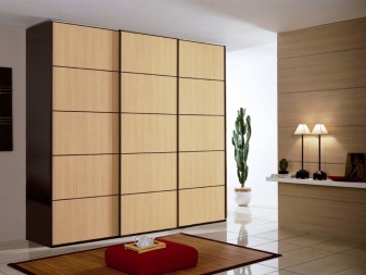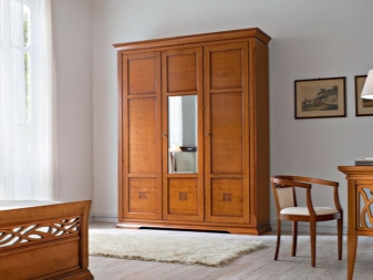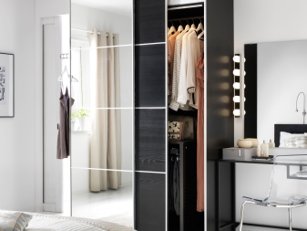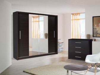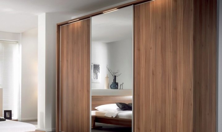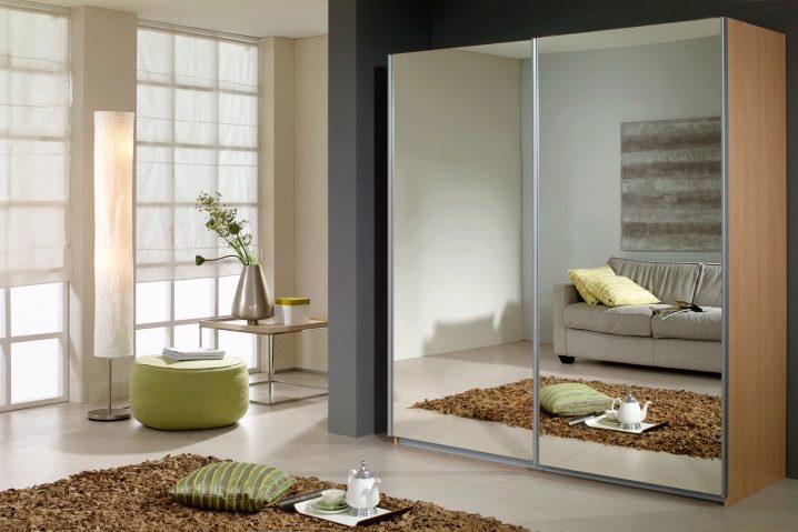 تتوافق أنواع المواد المدرجة بشكل جيد مع المرايا. ستعمل خزانة الملابس الكبيرة ذات الأبواب العاكسة على توسيع أي مساحة بصريًا. بالإضافة إلى ذلك ، ليس عليك العثور على مكان لوضع مرآة. خزانة الملابس هذه تكمل تمامًا غرفة النوم والممر..