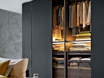 - خزانة إضاءة مثبتة على الحائط مع إضاءة. إذا كنت بحاجة إلى ترتيب عدد كبير من الأشياء – فهذا الخيار مناسب لك بالتأكيد. ستساعدك الكثير من الأرفف والشماعات والأدراج على وضع كل الملابس التي لديك. توفر الخزانة سراويل مريحة ورفوف للأحذية والحقائب. وستجعل الإضاءة الخلفية المثبتة الوصول إلى الأشياء أكثر ملاءمة. تعتبر خزانة الملابس هذه حلاً ممتازًا لغرفة النوم أو خزانة الملابس أو الرواق الواسع..