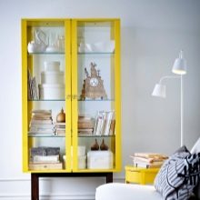 - خزانة عرض صفراء. ستصبح خزانة الملابس المشرقة والأنيقة هذه زخرفة حقيقية لمنزلك. ستعرض الأبواب المصنوعة من الزجاج الشفاف محتويات الأرفف بشكل فعال. في الوقت نفسه ، سوف يحمون الأشياء بشكل موثوق من الغبار والحركات المحرجة لأفراد الأسرة. سيكون مثاليًا إذا ظهر مثل هذا الظل المبهج في العناصر الداخلية الأخرى. من المؤكد أن الوظيفة والتصميم الأصلي للهيكل سيسعدان مالكه.