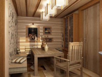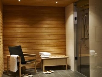 لإنهاء غرفة الملابس ، على العكس من ذلك ، من الأفضل استخدام الخشب الصنوبري ، مثل شجرة التنوب أو الصنوبر. نظرًا لأن هذه الغرفة ليست ساخنة جدًا في العادة ، فإن رائحة الإبر المنبعثة تحت تأثير الحرارة المعتدلة تملأ الغرفة برائحة لطيفة ، والتي لها ، من بين أمور أخرى ، خصائص مبيدة للجراثيم والقدرة على زيادة مناعة الإنسان. تساهم هذه الخاصية في مقاومة جسم الإنسان للأمراض المعدية..