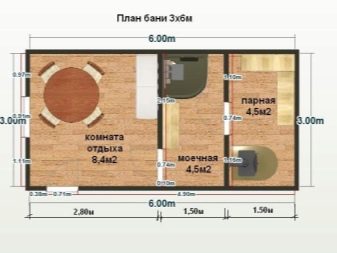 لذا ، تبلغ المساحة الإجمالية للحمام الداخلي 3 × 6 م حوالي 22 م² ، حيث ستكون المساحة الصالحة للاستخدام حوالي 17 م². في مثل هذا الحمام ، لا يمكن لأكثر من أربعة أشخاص الجلوس في نفس الوقت.. يمكن أن يكون هذا الخيار أحد أكثر التخطيطات ملاءمة..