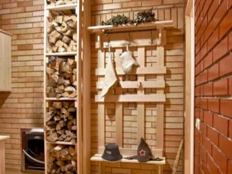 لتخزين الأشياء الضرورية ، الحطب ، الفحم ، ملحقات الحمام ، سيخدم منزل التغيير. يمكن حفظ الحطب في صندوق خاص. في بعض الحالات ، يتم تغذية الحطب أو الفحم في الموقد مباشرةً من الوشاح الموجود في غرفة المنزل..