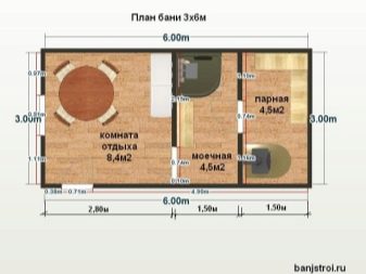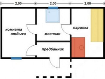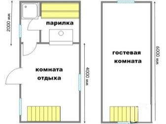 - مشروع 1. يوجد في غرفة الملابس الصغيرة على الجانب الأيسر باب يمكنك من خلاله الوصول إلى غرفة الاستراحة. وبالفعل من غرفة الاستراحة ، يمكنك الذهاب إلى غرفة الغسيل ، ثم إلى غرفة البخار. غرفة الاسترخاء وغرفة البخار من نفس الحجم. يسمح لك المبنى بوضع كل ما تحتاجه. هناك مساحة كافية للحوض. تقع غرفة الملابس أيضًا في موقع جيد.
