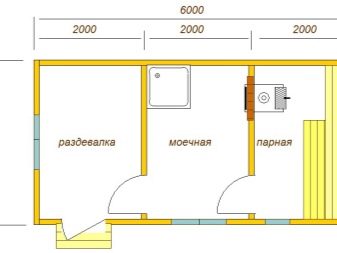 - المشروع 3. خيار يتم فيه منح جميع الغرف نفس المنطقة. وهي تقع على هذا النحو: غرفة خلع الملابس ، غرفة غسيل ، غرفة بخار. غرفة تغيير الملابس بها مساحة كافية للاسترخاء والتغيير..