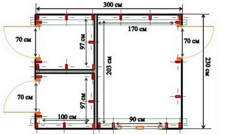 شعاع 100 × 100 مم مناسب لأعمدة الركن ، ويتم عمل فتحات منه ، حيث سيتم بعد ذلك تثبيت النوافذ والأبواب. يمكن أن تكون الرفوف الوسيطة مصنوعة من خشب 100 × 50 مم. يتم توصيل المكونات الداعمة بالربط السفلي باستخدام زوايا معدنية. يجب محاذاة كل جانب مع المستوى الرأسي. يمكن إصلاح الأجزاء مؤقتًا عن طريق أذرع الرافعة.