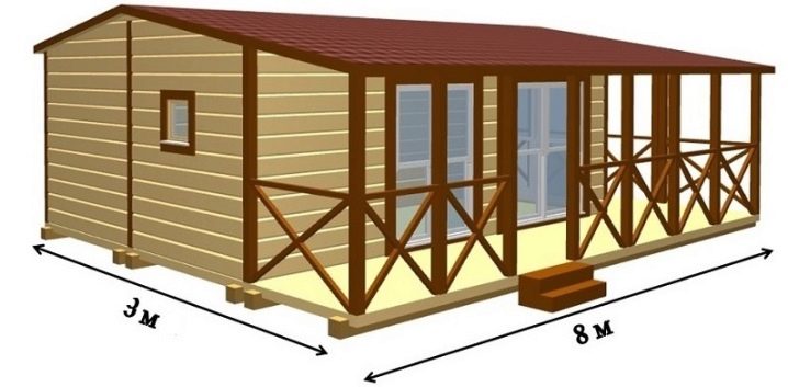 - يمكن تصميم مبنى مرافق واسع للغاية يحتوي على غرفتين بأبعاد 3 × 8 م. يمكن تمثيل المكون الأمامي لمثل هذا المبنى بتراس أو شرفة أرضية. نتيجة لذلك ، ستحصل على هيكل مريح وعملي للغاية ، يشبه المنزل الصغير..