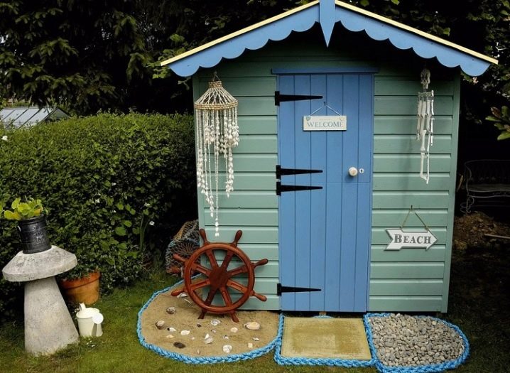 - يمكن أيضًا تصميم منزل ريفي صغير بأسلوب بحري غير متوقع. يجب طلاء جدران هذا المبنى باللون الأزرق الباهت أو الفيروزي أو النعناع. سقف مع مظلات زخرفية زرقاء سيفي بالغرض. من الأفضل اختيار الباب الأمامي من الخشب ورسمه باللون الأزرق..