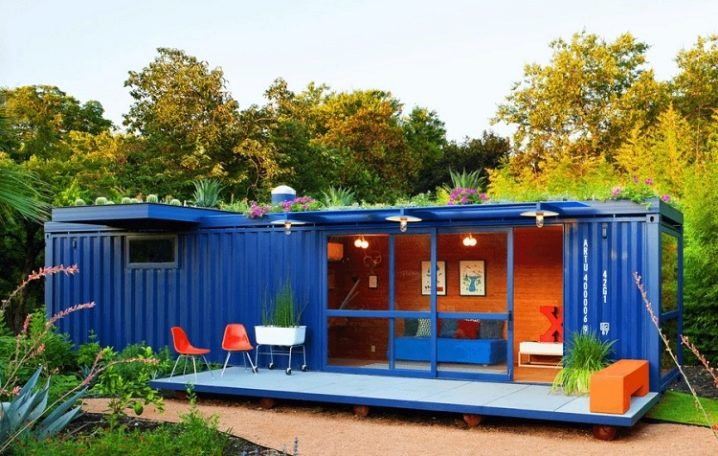 - ستبدو كتلة المرافق أصلية من الصفائح المعدنية الزرقاء ذات السقف الفاتح المتباين. باب زجاجي كبير مناسب للبناء. بجانب هذه الكتلة المنزلية ، يمكنك ترتيب الأشجار الصغيرة في الأواني أو أواني الزهور. ستبدو هذه المجموعة أنيقة وعصرية للغاية..