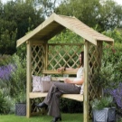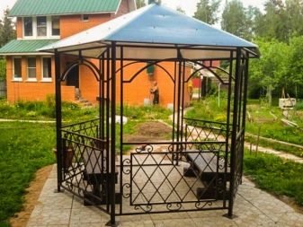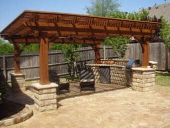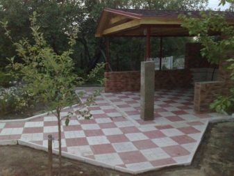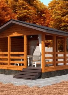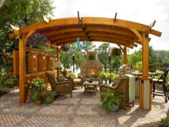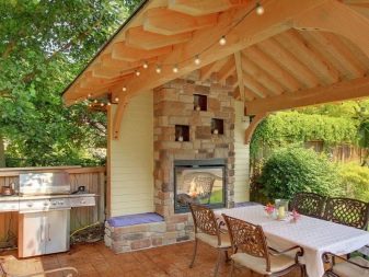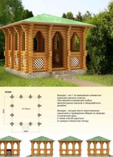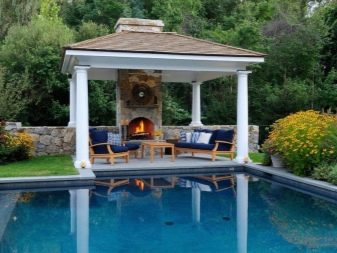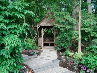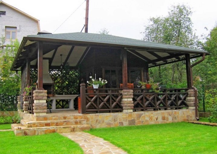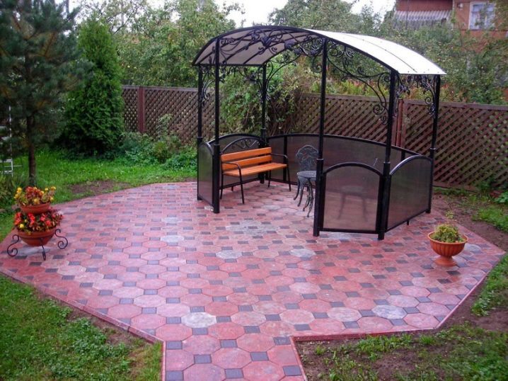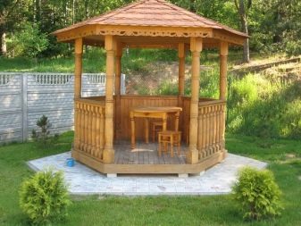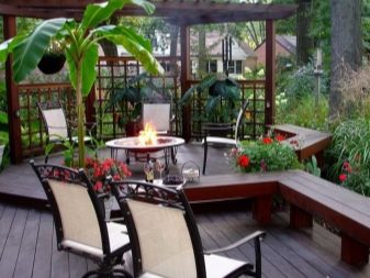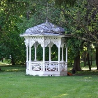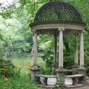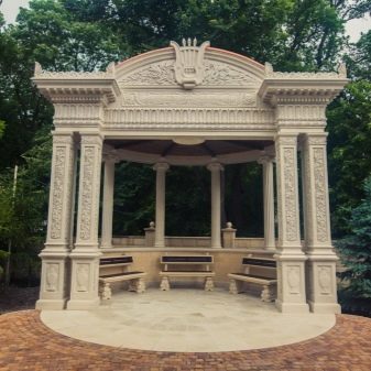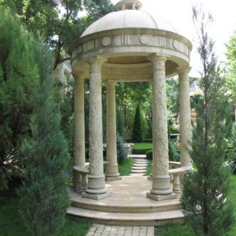 - شرفة صغيرة مصنوعة على الطراز العتيق. تبدو رائعة ، هي مزيج من البساطة والشكل المنتظم. مزينة بأنماط غنية ونقوش. نظرًا لموقعه بين الأشجار ، فإنه يسمح لك بالبقاء في الظل ، على الرغم من عدم وجود سقف. في الطقس الممطر ، لن يكون ملجأ من الماء ، لذلك يعتبر أكثر كديكور للموقع.
