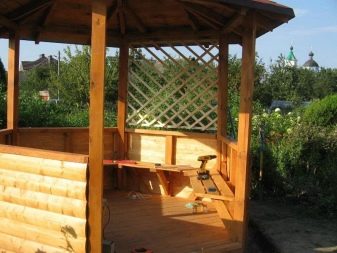 بعد تثبيت عناصر الحامل المصنوعة من الخشب أو أي مادة أخرى ، يجب قطعها من الأعلى. يُنصح بإجراء الخراطة بعد بناء إطار السقف. وتجدر الإشارة إلى أن إجراء إقامة شرفة المراقبة من الخشب والمعدن هو نفسه. الاختلاف الوحيد هو في الاتصال المستخدم لهذه المواد..