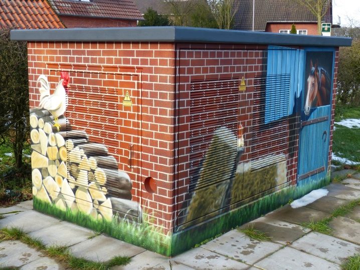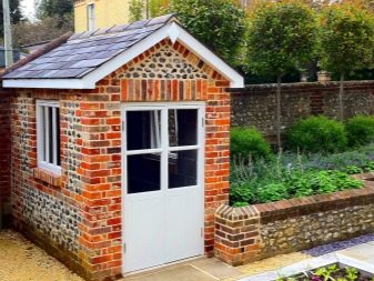 - كتلة منفعة من الطوب بسقف مستقيم. على الرغم من أن الخيار بسيط للغاية ، إلا أنه يبدو أصليًا بسبب الكتابة على الجدران. إذا كنت ترغب في تنويع الموقع ، وجعله أكثر إشراقًا ، فعليك إلقاء نظرة فاحصة على هذا المبنى.