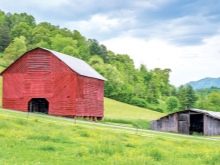 - حظيرة حمراء داكنة مع حطب مفتوح ؛