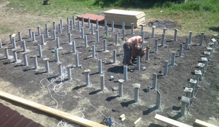 يجب وضع الدعامات بحيث تكون موجودة بالضبط في جميع الزوايا. يجب أن تكون الفجوة من عمود إلى آخر حوالي 1.5-2 م ويتم إزالة الطبقة العليا من التربة في أي حال. يتم وضع قضبان التسليح بزيادات قدرها 0.07 م.