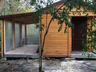 إذا كنت تريد أن تفعل ظلة بالقرب من السقيفة ، يجب أيضًا أخذ ذلك في الاعتبار عند إنشاء الإطار. عادةً ما تُستخدم هذه المساحة الصغيرة للراحة بعد العمل وتعليق حوض الغسيل وتخزين الأدوات المستخدمة مؤقتًا. يجب ألا تكون المظلة كبيرة جدًا حتى لا تفرط في تحميل الهيكل.