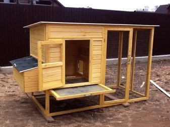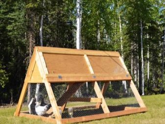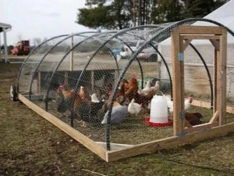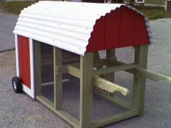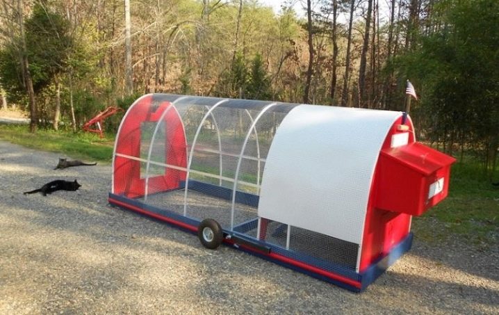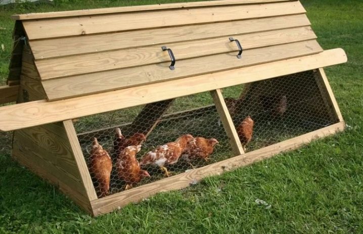 غالبًا ما يتم صنع أقفاص الدجاج المحمولة بهذه الطريقة منطقتين منفصلتين. جزء واحد مخصص للطيور لاحتضان بيضها. الجزء الثاني مطلوب لمشي الدجاج. ستكون هذه العينة أفضل خيار صيفي. اليوم ، الحل الشائع بين سكان الصيف هو نماذج مع منطقة مفتوحة إضافية على الجانبين والسقف والعشب. تتيح هذه الخيارات حماية الطيور من الأشعة فوق البنفسجية الضارة..