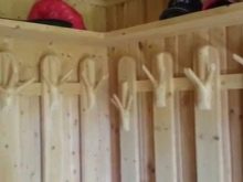 لتصنيع شماعات بقايا الخشب مناسبة تمامًا. قم بتوصيل الألواح بمسامير أثاث ، ثم قم بتغطيتها بالطلاء والورنيش ، ثم قم بتثبيت الخطافات. أيضًا ، يتم الحصول على شماعات غير عادية للحمام من العقد. لهذا الغرض ، فإن الفروع ذات الشوكات على شكل حرف Y مناسبة..