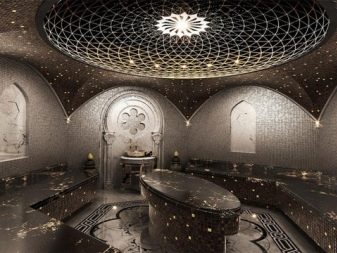 هذا حمام تركي تقليدي. لديها عدد من الميزات. لا تزيد درجة حرارة الهواء في مثل هذه الساونا عن 50 درجة. في نفس الوقت ، يتم الحفاظ على الرطوبة بنسبة 100 بالمائة. لا يوجد موقد بالحجارة يتم تغذية المياه إليه. يتم تدفئة الجدران وكراسي الاستلقاء للتشمس والأرضيات بشكل متساوٍ بفضل أنابيب المياه الساخنة التي تجري تحتها. تستخدم مولدات البخار لتوليد البخار. جميع الأسطح في هذا الحمام مصنوعة من الحجر والبلاط. تقليديا كانت مصنوعة من الرخام. تم التصميم بأسلوب شرقي. الحرارة المتساوية والناعمة التي تنتشر من جميع الأسطح في الحمام تدفئ الجسم كله بلطف.