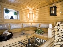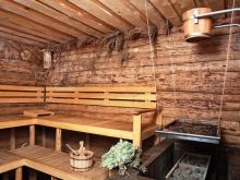 في الداخل ، كل شيء مجهز ، كما هو الحال في الساونا العادية – مدفأة وأرفف ومقاعد مصنوعة من الخشب. تتكون الجدران والأسقف من كسوة خشبية داخلية وصوف حجري وكسوة خارجية.