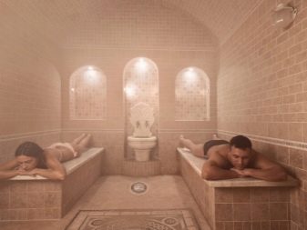 هذه الساونا مثالية لأولئك الذين يجدون صعوبة في تحمل حرارة غرفة البخار الفنلندية.. في الحمام التركي ، عليك أولاً الإحماء على كرسي استلقاء حجري لمدة 15-20 دقيقة. خلال هذا الوقت ، ستبدأ المسام في الانفتاح وسيبدأ إجراء التطهير الطبيعي. في نفس الوقت من الجيد تقشير الجلد. قم بأداء ذلك بقفاز من شعر الجمل.