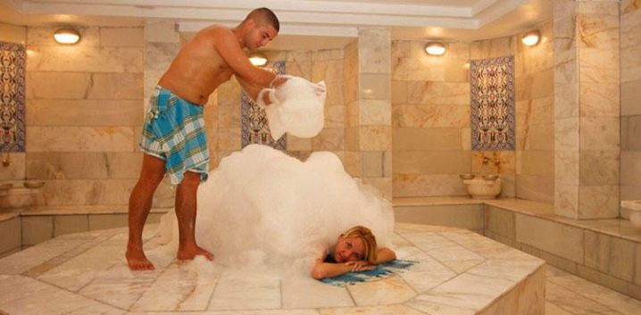 الإجراء التالي هو – تدليك بالصابون. تُخفق الرغوة في كيس كبير وتوضع على الجسم. من الأفضل استخدام الصابون الطبيعي المصنوع من الزيوت النباتية. ويلي ذلك تدليك مريح. بعد كل هذا ، يمكنك الاسترخاء في غرفة باردة وشرب الشاي. بعد أن يبرد الجسم ويصل إلى درجة حرارته الطبيعية ، يمكنك الخروج من المنزل..