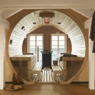 بالإضافة إلى ذلك ، هناك أنواع أخرى من حمامات البخار ، على سبيل المثال, ساونا يابانية. إنه برميل يقع تحته الفرن. يتم تسخين المياه في مثل هذه الساونا حتى 50 درجة ، وتضاف إليها العديد من الأعشاب ونشارة الخشب. ميزة الساونا اليابانية هي قدرتها على الحركة..