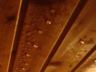 قد تكون هذه الظاهرة غير السارة مصحوبة بتعفن المواد التي تم بناء الحمام منها. هذه الأجزاء الخشبية بشكل أساسي من المبنى. قد تظهر كمية كبيرة من العفن الفطري على الجدران والسقف ، وكذلك تحت الكسوة. يتشكل الصدأ على الأسطح المعدنية.