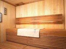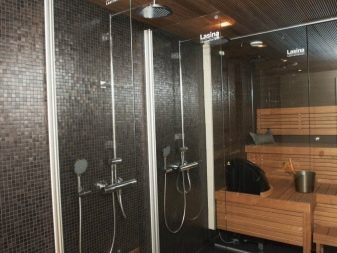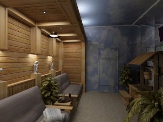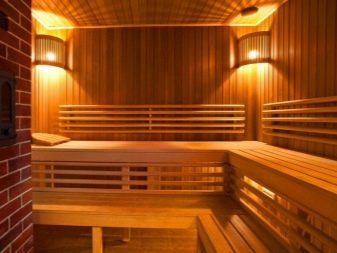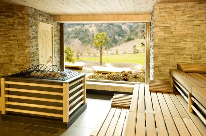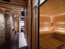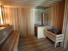 لا توجد متطلبات صارمة لغرف الاستجمام ، ولكن من الأفضل جعل هذه الغرفة متسقة مع مفهوم التصميم العام. لهذا السبب ، يختار الكثير من الناس الخشب. يمكنك أيضًا طلاء الجدران ، لكن يجب اختيار طلاء مقاوم بدرجة عالية للحرارة والرطوبة..