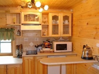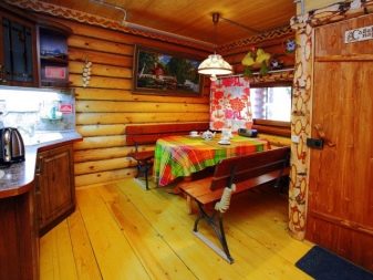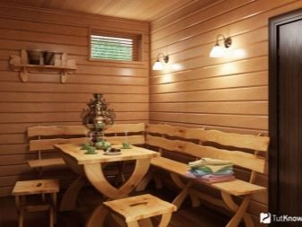 في غرفة المطبخ في الحمام ، يوصى باستخدام مقاعد واسعة ، والتي يجب أن تكون مريحة قدر الإمكان ، وطاولة خشبية كبيرة يمكن لجميع الضيوف استيعابها بسهولة. يجب أن تهتم بتوافر السماور أو الغلاية ، والأرفف لجميع الأشياء الضرورية ، وشراء كمية كافية من الأطباق. يمكنك وضع أجهزة الفيديو والصوت في المطبخ.
