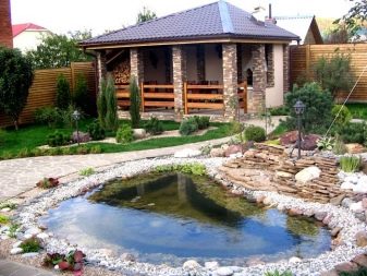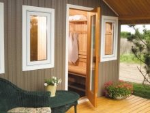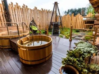 ولكن إذا لم يكن هناك خزان أو حوض سباحة في الموقع ، فيمكنك تنظيم منطقة ترفيهية بها شرفة مراقبة أو أراجيح شبكية. في الحمام الكبير ، يمكن وضع منطقة الاسترخاء تحت سقف واحد أو على الشرفة في فصل الصيف.