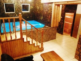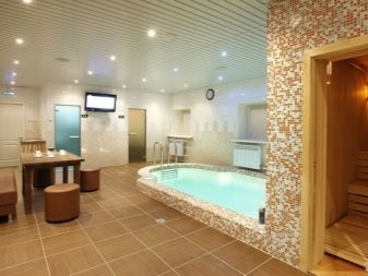 في الآونة الأخيرة ، لا يعد الحمام مع مسبح عنصرًا فاخرًا. يمكنك تجهيز مسبح كامل في منطقة مفتوحة وتحت نفس السقف مع ساونا. في متاجر الأجهزة ، يمكنك شراء أوعية جاهزة بعمق متر واحد – سيكون هذا المسبح كافياً حتى بالنسبة لشركة كبيرة. ولإضفاء مظهر أكثر جاذبية على الهيكل النهائي ، يمكن تبطين الجدران الداخلية للوعاء ببلاط السيراميك..