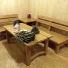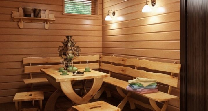 أثاث الحمام هو مرحلة مهمة في الترتيب. ليس من الضروري تركيب أثاث منسوج مع وسائد زخرفية في منطقة الترفيه. بسبب الرطوبة العالية ، سوف يتدهور النسيج بسرعة ويفقد مظهره الأصلي. تكفي طاولة صغيرة مع مقاعد مريحة أو كراسي خشبية. الأكثر راحة في منطقة الاستجمام هي المقاعد الواسعة ، حيث يمكنك الاستلقاء عليها والاسترخاء بعد غرفة البخار. اعتمادًا على تفضيلاتك ورغباتك ، يمكن أن يكون للمقاعد ظهر وأن تكون بأطوال مختلفة.
