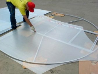 يبلغ طول صفائح البولي كربونات 6 أمتار وعرضها 2.1 مترًا. عند إنشاء رسم ، يجب على المرء أن ينطلق من هذه المعلمات. يمكن تقطيع الصاج إلى قطع 3×2.1 متر. وأيضًا يعتبر تنسيق العمل بحجم ورقة 1.5 × 2.1 متر. ليس من السهل تقسيم المادة حسب العرض ، لذلك نادرًا ما ترى مثل هذه الأشياء..