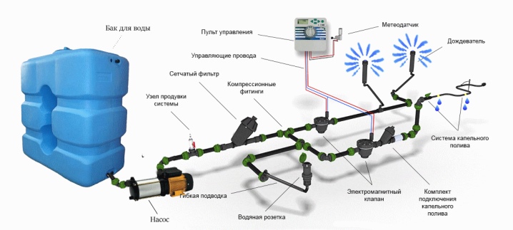 ومع ذلك ، فإن جهاز أنظمة الري الأوتوماتيكي لا يختلف عمليا ويتضمن العناصر التالية: