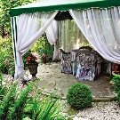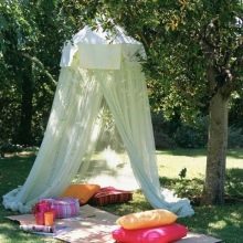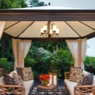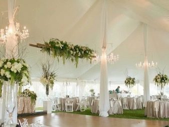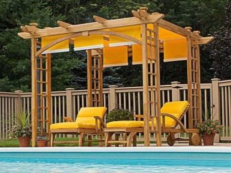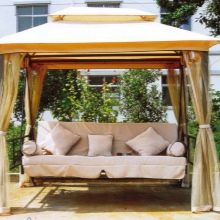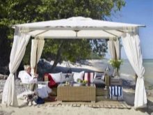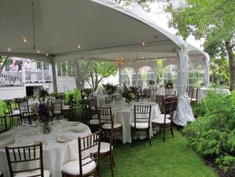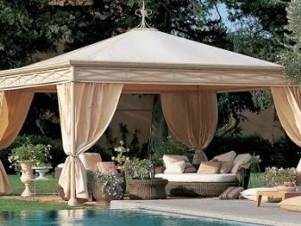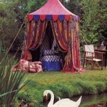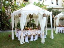 - تبدو عرش الخيام الخاصة ، والتي تُستخدم لتزيين الموقع ، مشرقة وأنيقة بشكل خاص. الخيار الأكثر شيوعًا في هذه الحالة هو القاعة المستديرة. يمكننا أن نقول بأمان أن هذه الهياكل هي عمل فني حقيقي بسقف مخروطي الشكل ، يصعب النظر إليه بعيدًا..