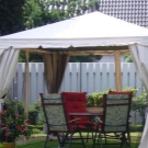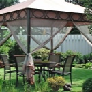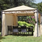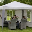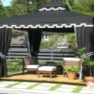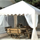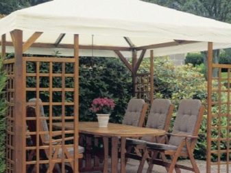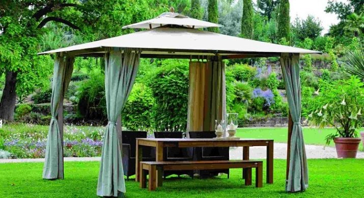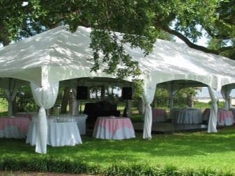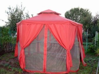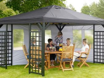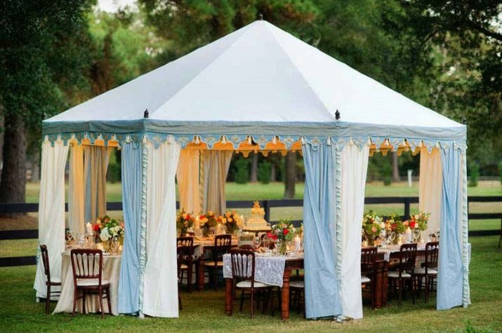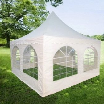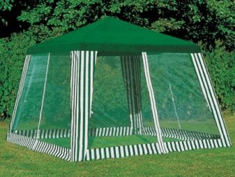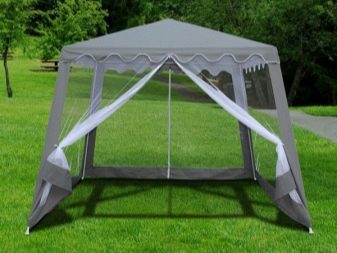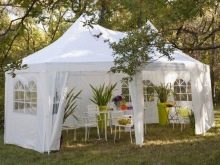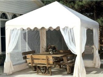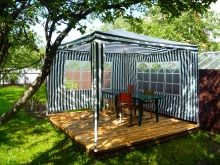 - إذا كان كوخك الصيفي أو قطعة أرض حديقتك يقع في منطقة ممطرة ، فيجب عليك شراء منشآت حصرية بنسيج مقاوم للماء. يمكن أيضًا معالجته بشكل إضافي بمركب خاص. من المستحسن أن يكون للخيمة جدران سميكة.