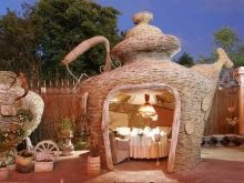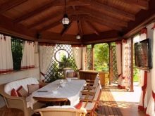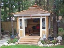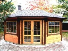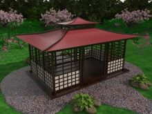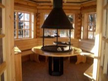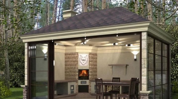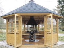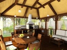 مع وجود مساحة كبيرة بالداخل ، سوف يقومون بتجهيز منطقة الشواء المصممة بحوض ، مرجل ، موقد ، حطب. في الوقت نفسه ، يعتمد التصميم على نوع المواد المستخدمة ، بالإضافة إلى الحل الأسلوبي المختار وظلال المواد. لذلك ، في حالة واحدة ، تكون الألواح الخشنة غير المعالجة كافية ، بينما توفر المشاريع الأخرى حتى وجود الستائر. في هذه الحالة ، يمكن أن يكون للهيكل أيضًا تصميم طبيعي ، على سبيل المثال ، من خلال تنسيق الحدائق الخارجية..