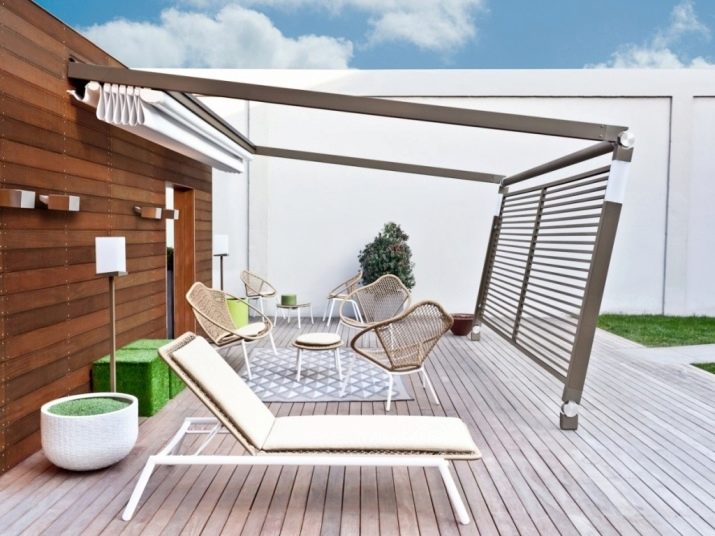يمكنك التفكير في ترتيب منطقة مفتوحة باستخدام نوع مختلف من المظلات. سيسمح لك ذلك بالاختباء من أشعة الشمس والمطر ، وكذلك تجهيز المنطقة أمام مدخل شرفة المراقبة. يمكنك حتى إخراج الكراسي وتعليق الأرجوحة ووضع طاولة متحركة صغيرة للعمل على جهاز كمبيوتر محمول. يمكن طي المرفق إذا لزم الأمر لتجنب كسره.