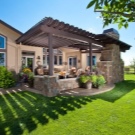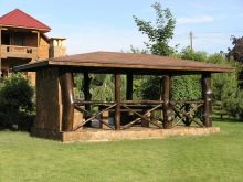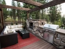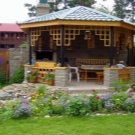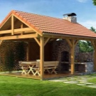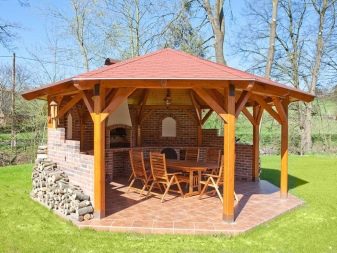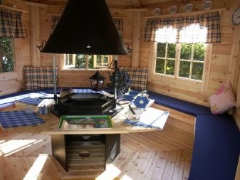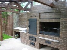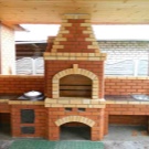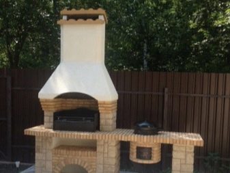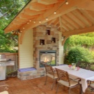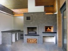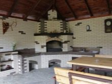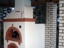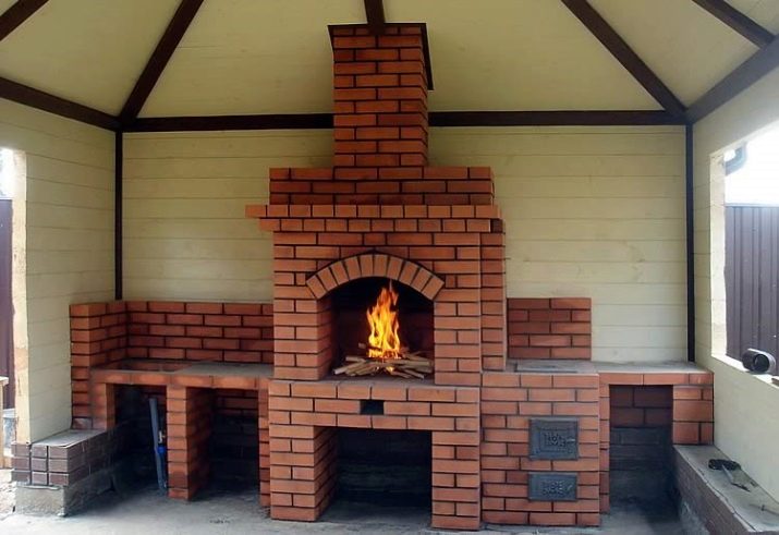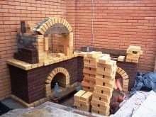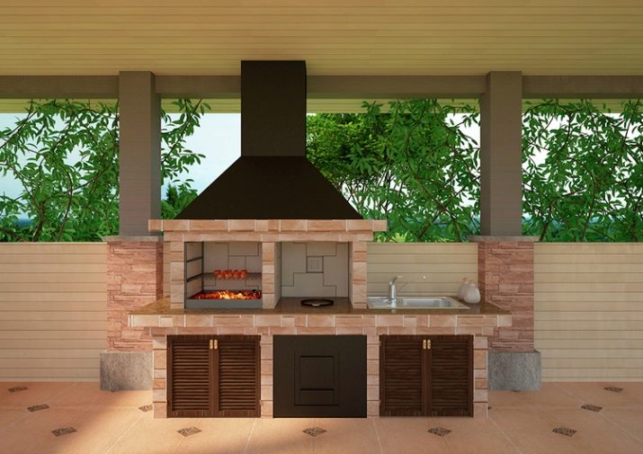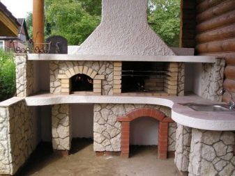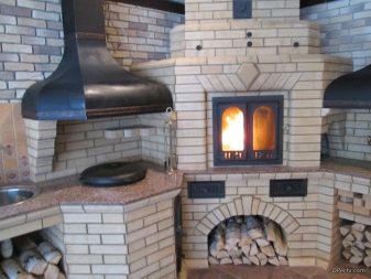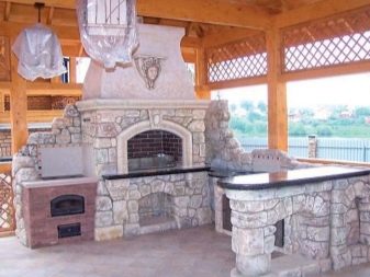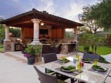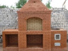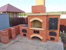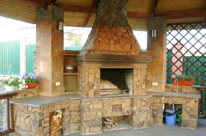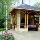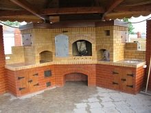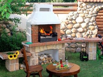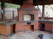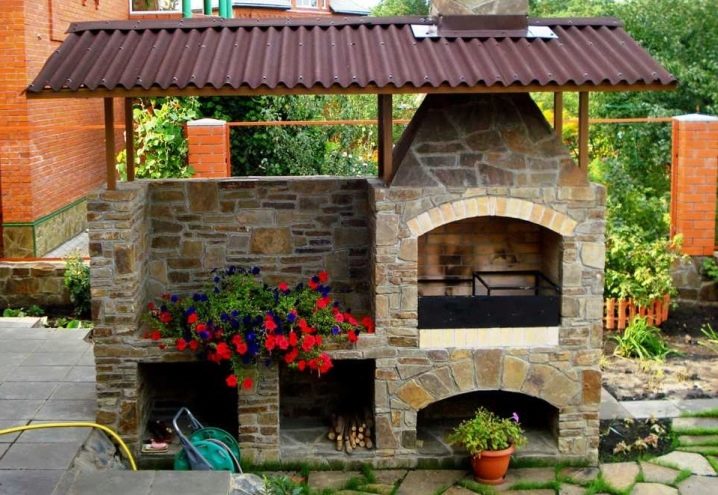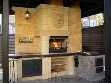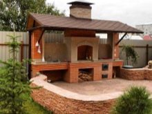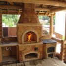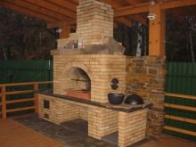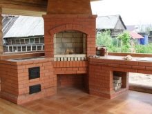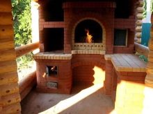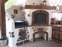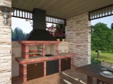 تُظهر هذه الصورة مزايا البناء الأكثر سلاسة ، حيث يتم وضع الموقد في شرفة صغيرة نسبيًا ، منظمة بمظلة. يتم لعب دور مهم في الزخرفة من خلال الرف الحجري للمساحات الخضراء الموضوعة على اليسار ، والتي توجد تحتها مقصورات لتخزين العناصر المختلفة.