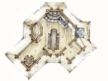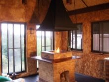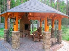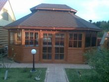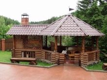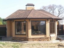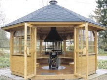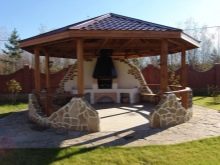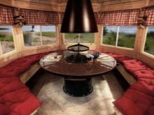 لو هذا نسخة كلاسيكية من النوع الريفي بأسلوب التبسيط, قد يتكون تخطيط الترتيب الداخلي من شواء من جانب ، بالإضافة إلى طاولة بمقعدين على الجانب الآخر. من الممكن ترتيب أكثر إثارة للاهتمام من خلال مشروع تصميم مع موقد في أحد الجدران ، حيث تحتوي شرفة المراقبة المكونة من 8 وجوه ، بالإضافة إلى السقف ، على أعمدة دعم وحواجز مزورة وأرضية حجرية. من الأفضل وضع أثاث من الخيزران في الوسط هنا..