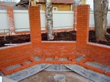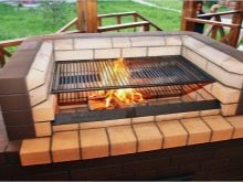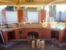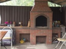 اختياريا جعل مكانا للأطباق. سوف تحتاج إلى موقد مرجل. يمكن أن يكون هذا خيارًا مع حلقات قابلة للإزالة. بعد عمل القاعدة للشواء ، ضع سطحًا من طوب النار. ثم ينظمون مدخنة ويشكلون قناة لمدخن., الصفوف معززة بالأسلاك. ثم يتعاملون مع قبو الموقد ، ويضعون الجدران ويفحصونها في نفس الوقت بمستوى. في هذه الحالة ، يمكن تمديد الجدار الخلفي إلى ما بعد المحيط.